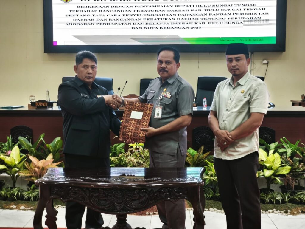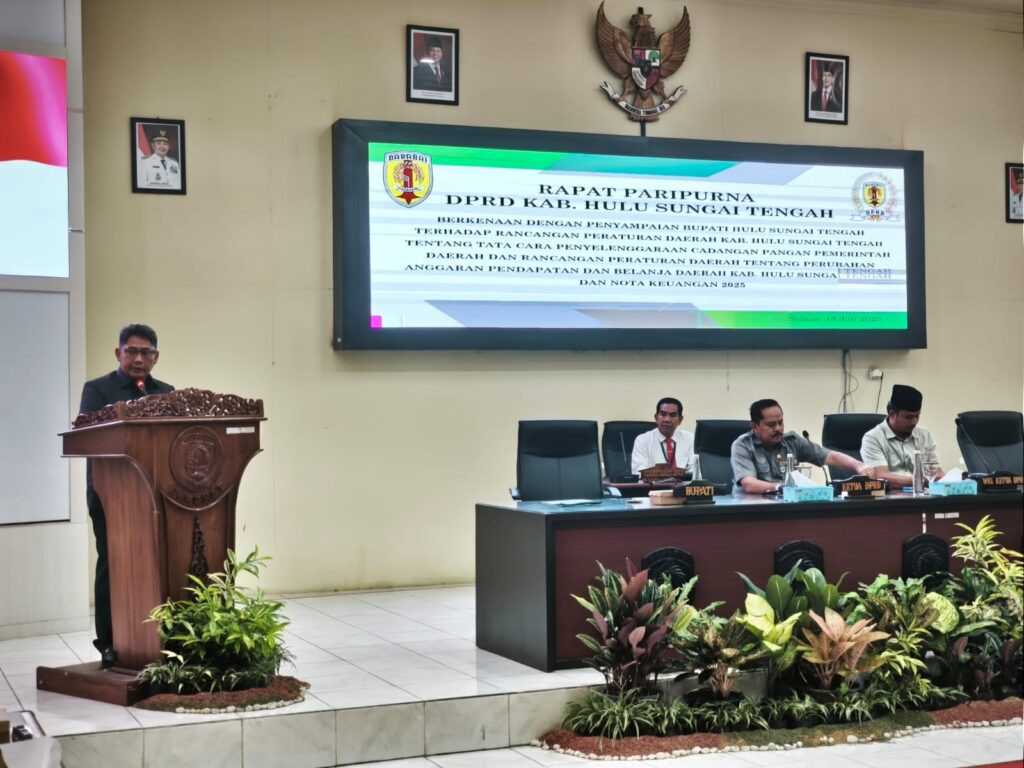 KALSELPOPULER.ID, BARABAI – Pemerintah Kabupaten Hulu Sungai Tengah (HST) bersama DPRD HST menggelar Rapat Paripurna dengan agenda penyampaian dua Rancangan Peraturan Daerah (Raperda), yakni Raperda tentang Perubahan Anggaran Pendapatan dan Belanja Daerah (APBD) Tahun Anggaran 2025 serta Raperda tentang Tata Cara Penyelenggaraan Cadangan Pangan Pemerintah Daerah. Rapat berlangsung di Gedung DPRD Kabupaten HST, Jalan H. Hasan Baseri Barabai, Selasa malam (15/7/2025).